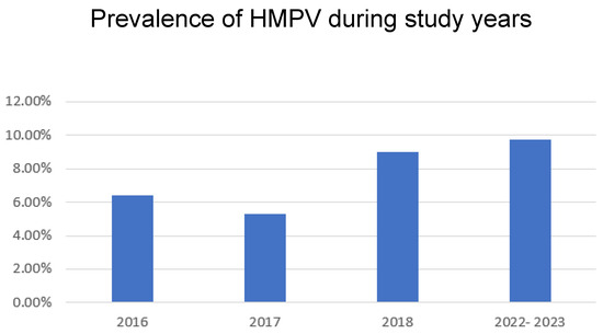 A total of 7708 viral panels were evaluated. During the first study period, 1357 respiratory samples were positive for at least one respiratory tract virus, and 2197 were positive in the post-COVID period. The bar chart shown in Figure 1 illustrates the annual trends in HMPV prevalence across the specified years. The prevalence of HMPV infection varied by year, being lowest in 2017 and highest during the post-COVID period. Initially, HMPV prevalence exhibited a minor year-on-year fluctuation, being approximately 6.4% in 2016, followed by a slight decrease to 5.3% in 2017. Subsequently, the data indicate an increasing trend in HMPV prevalence from 2017 onwards, culminating in the highest recorded prevalence during the most recent period (2022–2023).