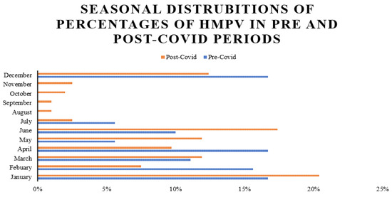 Seasonal distributions of percentages of HMPV in pre- and post-COVID periods.