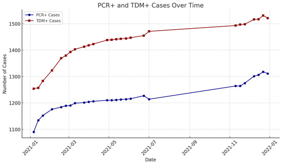 The data in this figure highlight daily variations in both PCR+ and CT+ detections, with CT+ cases consistently exceeding PCR+ cases. This trend suggests that CT imaging often identifies additional cases beyond PCR testing, underlining the importance of multi-method diagnostic strategies. More importantly, the daily fluctuations provide insights into healthcare system burdens, since sudden peaks in detections can significantly strain local resources. The steady increase throughout 2021 may reflect ongoing transmission despite public health efforts, potentially influenced by factors such as new variants, fluctuating testing availability, and vaccination campaigns. The slight acceleration in cases after November 2021 suggests a possible late-year resurgence or winter weather involvement, underscoring the need for sustained surveillance and adaptive public health measures to control the spread of infections effectively.