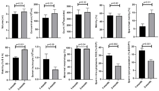 As shown in Figure 1, the sperm parameters [concentration (146.93 ± 22.74 vs. 119.72 ± 18.19; p = 0.23), (count (410.72 ± 62.49 vs. 370.32 ± 73.98; p = 0.32), motility (53.58 ± 4.99 vs. 54.96 ± 5.85; p = 0.82), semen volume (3.30 ± 0.34 vs. 3.00 ± 0.27; p = 0.23), and semen leucocyte (0.44 ± 0.12 vs. 0.92 ± 0.24; p = 0.05)] were compared at 1 and 3 months after the COVID-19 diagnosis. The analysis clearly shows that the mean of sperm vitality (75.02 ± 1.89 vs. 55.00 ± 2.44; p < 0.001) and fast motility (14.56 ± 2.15 vs. 6.52 ± 1.57; p = 0.01) significantly improved after 3 months compared to 1 month from the diagnosis of COVID-19. The percentage of abnormal sperm morphology (97.08 ± 0.21 vs. 97.72 ± 0.29; p = 0.04), sperm lipid peroxidation (11.08 ± 0.75 vs. 17.54 ± 1.42; p = 0.001), and intracytoplasmic ROS (16.83 ± 2.6 vs. 29.7 ± 2.69; p < 0.002) significantly decreased after 3 months compared to 1 month from the diagnosis of COVID-19 in men.