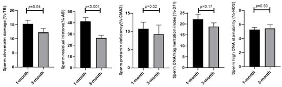 In addition, sperm functional parameters such as sperm abnormal chromatin, protamine deficiency, residual histones, and sperm DNA fragmentation were assessed. The results in Figure 2 demonstrate that unlike sperm DNA fragmentation (18.87 ± 1.71 vs. 22.16 ± 2.37; p = 0.17) and high DNA stainability (5.45 ± 0.52 vs. 5.25 ± 0.34; p = 0.93), where the means were similar after 3 months compared to 1 month from the diagnosis of COVID-19, the mean of sperm abnormal chromatin (12.28 ± 1.37 vs. 15.20 ± 1.38; p = 0.04), protamine deficiency (9.28 ± 2.5 vs. 10.74 ± 1.82; p = 0.02), and residual histones (26.48 ± 2.46 vs. 41.24 ± 3.47.; p < 0.001) significantly reduced after 3 months compared to 1 month from the diagnosis of COVID-19.