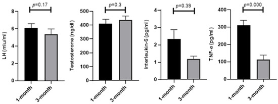 As demonstrated in Figure 3, serum factors in the blood such as LH (5.36 ± 0.64 vs. 6.08 ± 0.52; p = 0.17), testosterone (435.97 ± 29.19 vs. 411.56 ± 29.97; p = 0.3), and interleukin-6 (1.18 ± 0.17 vs. 2.35 ± 0.52; p = 0.39) did not change, while TNF-ɑ (112.3 ± 26.09 vs. 309.87 ± 29.63; p = 0.001) showed a significant improvement at 3 months compared to 1 month from the diagnosis of COVID-19.