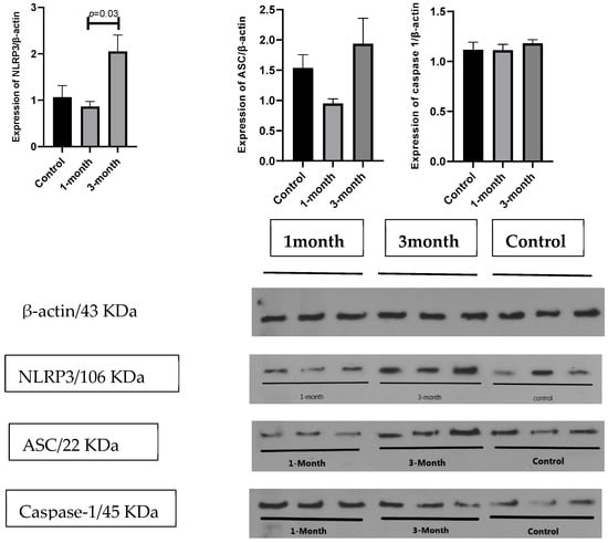 In addition, we assessed the expression of the main components of the NLRP3 inflammasome complex (NLRP3, ASC, and caspase-1) at the protein level by the Western blot technique in three individuals. The results in Figure 4 show that unlike the mean expression of ASC (1.93 ± 0.41 vs. 0.94 ± 0.07), and caspase-1 (1.18 ± 0.03 vs. 1.11 ± 0.05), which were not different after 3 months compared to 1 month from the diagnosis of COVID-19, the mean of NLRP3 protein (2.05 ± 0.35 vs. 0.86 ± 0.11; p = 0.03) significantly increased after 3 months compared to 1 month from the diagnosis of COVID-19.