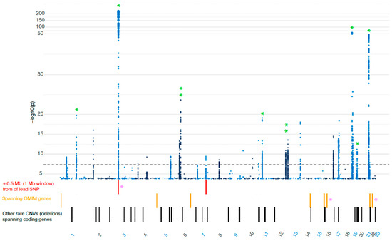 The genomic location of the 61 rare deletions identified in our COVID-19 cohort, plotted in relationship to the largest GWAS focused on severe COVID-19 (cases = 21,294, controls = 2,182,461, COVID-19 Host Genetics Initiative, Release 7) [22] * PINK = genes implicated in COVID-19, * GREEN = locus also overlaps with COVID-19 susceptibility locus. SNP, single nucleotide polymorphism; OMIM, Online Mendelian Inheritance in Man database; CNV, copy number variation.