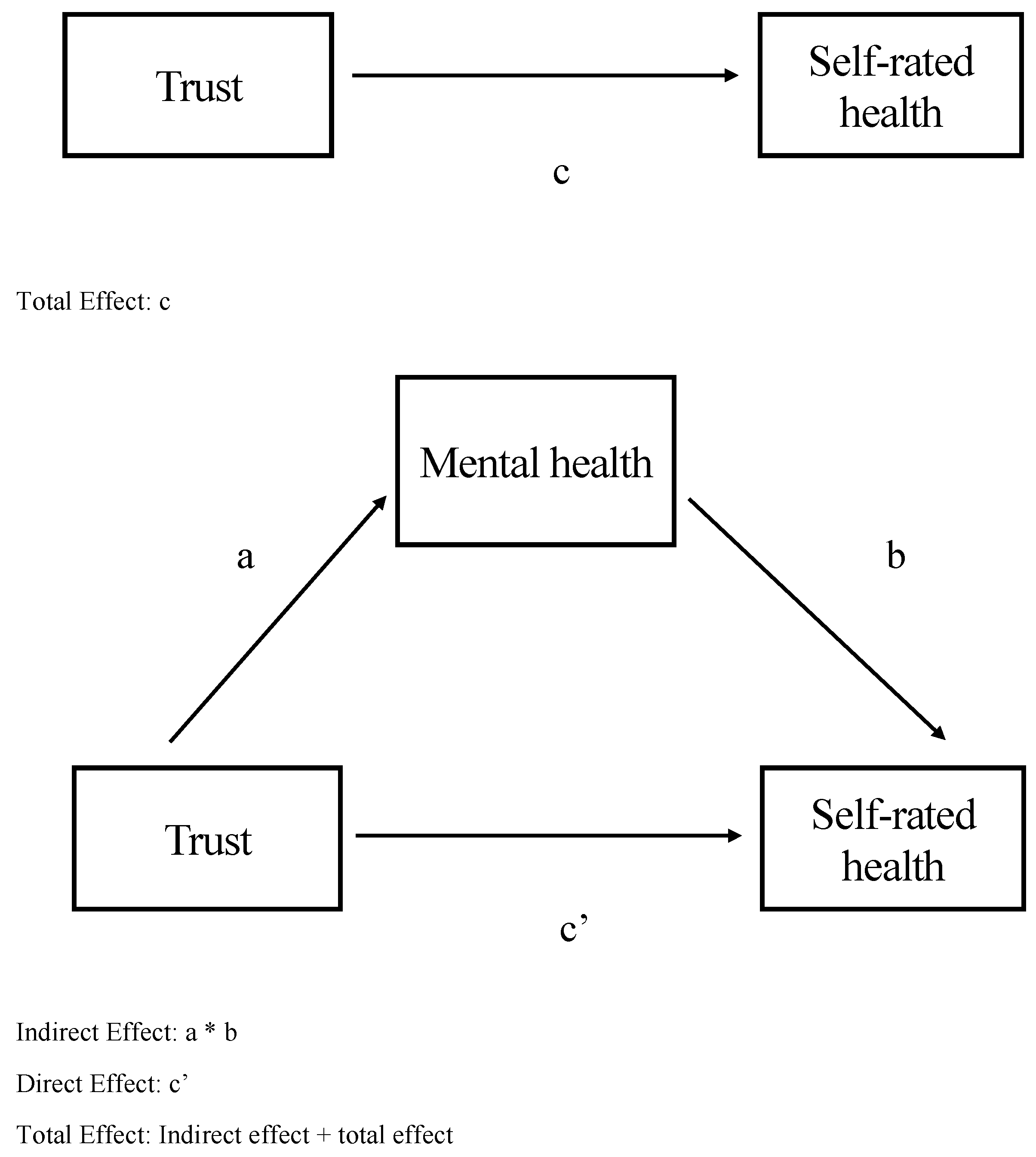 | Total effect Informal trust → self-rated health | c (indirect + direct) | 0.004 | (−0.277, 0.284) |