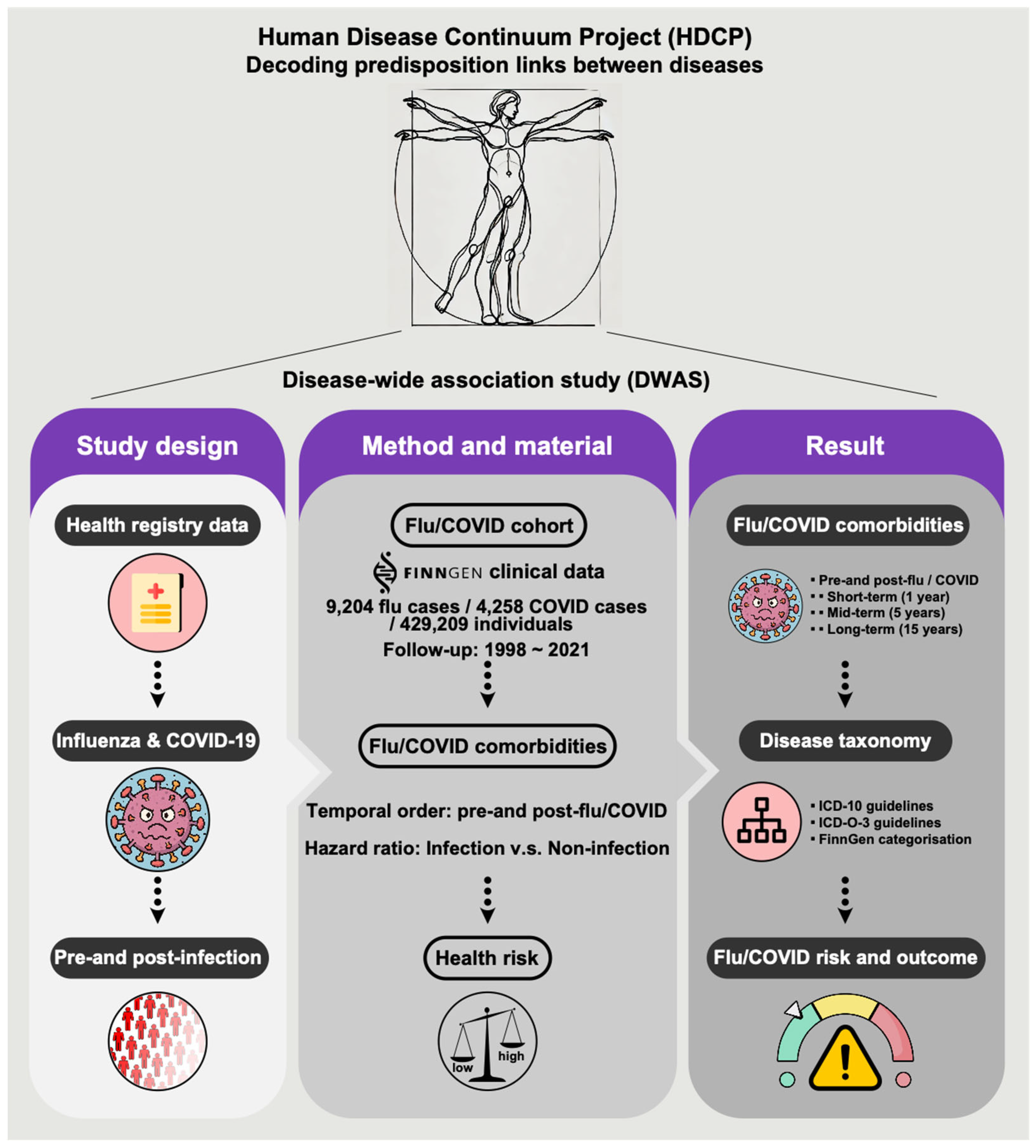 To address these critical gaps, this study leveraged a large-scale cohort to conduct a disease-wide association study (DWAS), systematically mapping the landscape of health outcomes following influenza. This DWAS approach was chosen due to its ability to capture the broad spectrum of disease associations and its previous successful application in investigating systemic conditions such as stroke, depression, and Alzheimer’s disease [