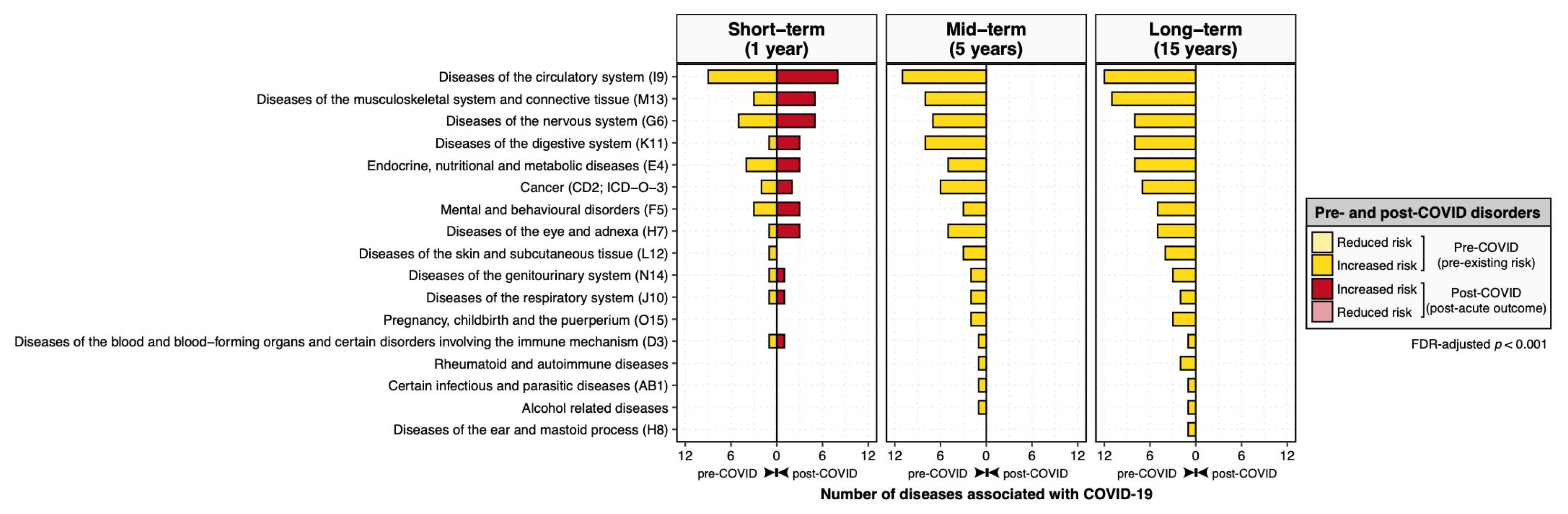 These extensive associations underscore the systemic nature of COVID-19, highlighting its capacity to affect nearly every major organ system. Furthermore, the results provide critical insight into the long-term health burdens attributable to COVID-19, extending well beyond the acute phase of infection and shedding light on the complex pathophysiological consequences that persist in the long-term recovery phase.