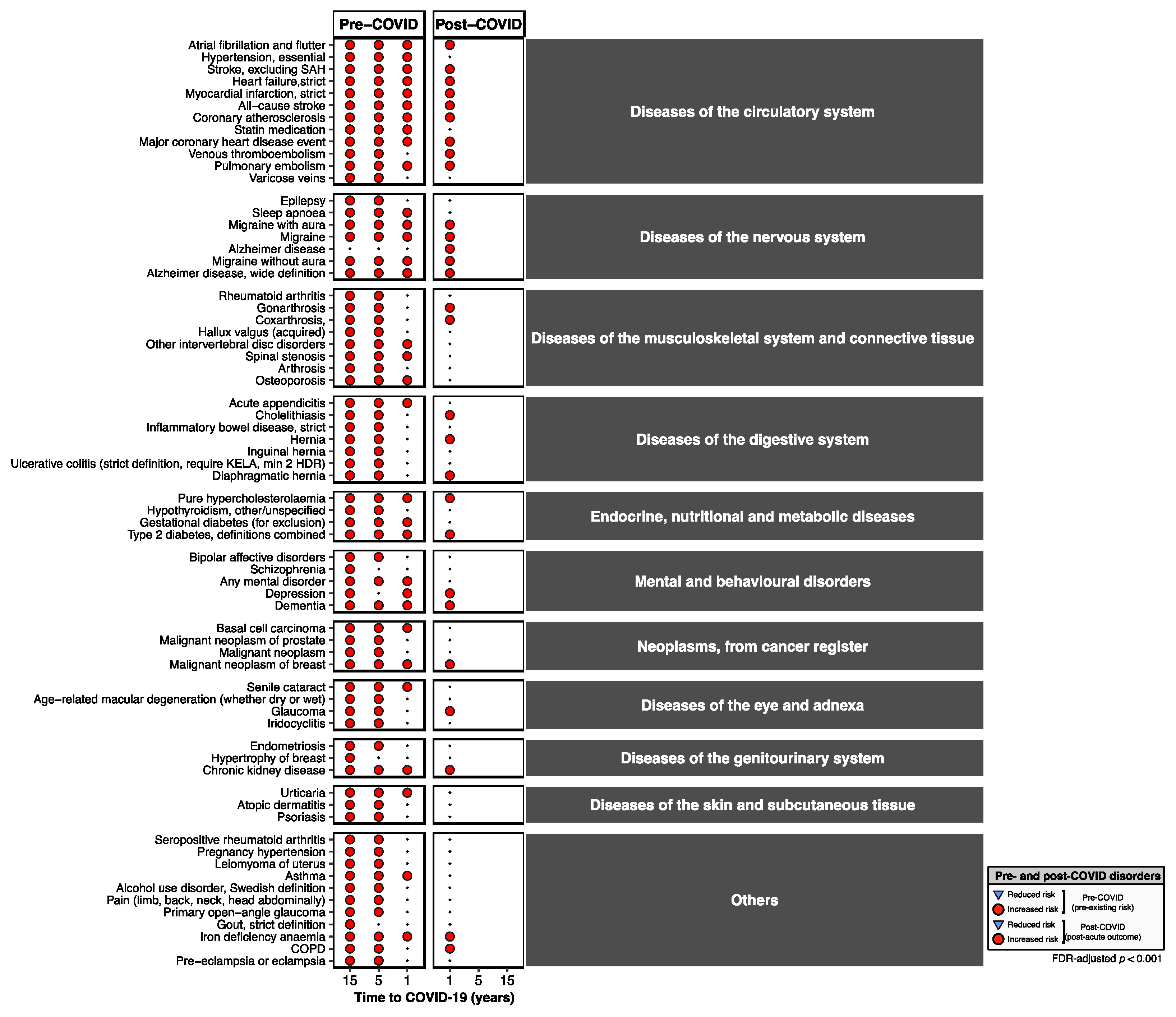 Our findings indicate that individuals with established chronic health conditions were at a substantially higher risk for both contracting COVID-19 and developing post-COVID sequelae. The most pronounced pre-existing risk factor was cardiovascular disease (CVD). A range of CVD diagnoses, including atrial fibrillation and flutter, hypertension, stroke, heart failure, myocardial infarction, coronary atherosclerosis, major coronary heart disease, venous thromboembolism, pulmonary embolism, and varicose veins, were all strongly associated with an increased likelihood of future COVID-19 infection (