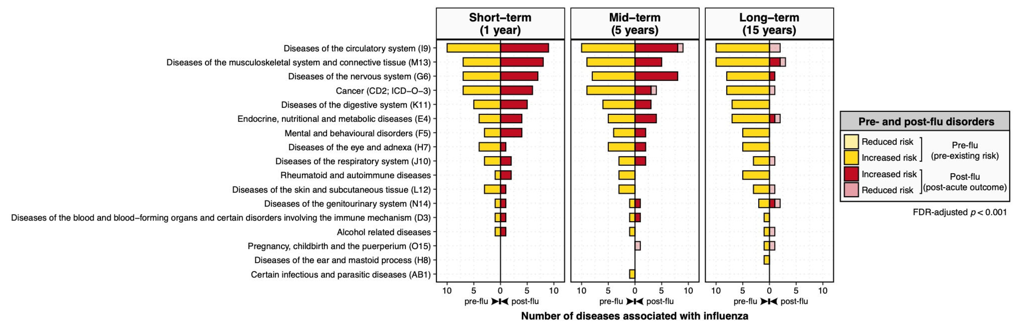 The central objective of this study was to characterize the post-acute landscape of incident disease following influenza. This analysis of the post-infection period identified a substantial burden of new-onset morbidity across multiple organ systems, with many risks persisting for years after the acute infection. The temporal dynamics of these sequelae were heterogeneous; some risks were concentrated in the immediate post-infection period, while others remained significantly elevated for up to one to fifteen years, defining a clear ‘long flu’ phenotype (FDR-adjusted