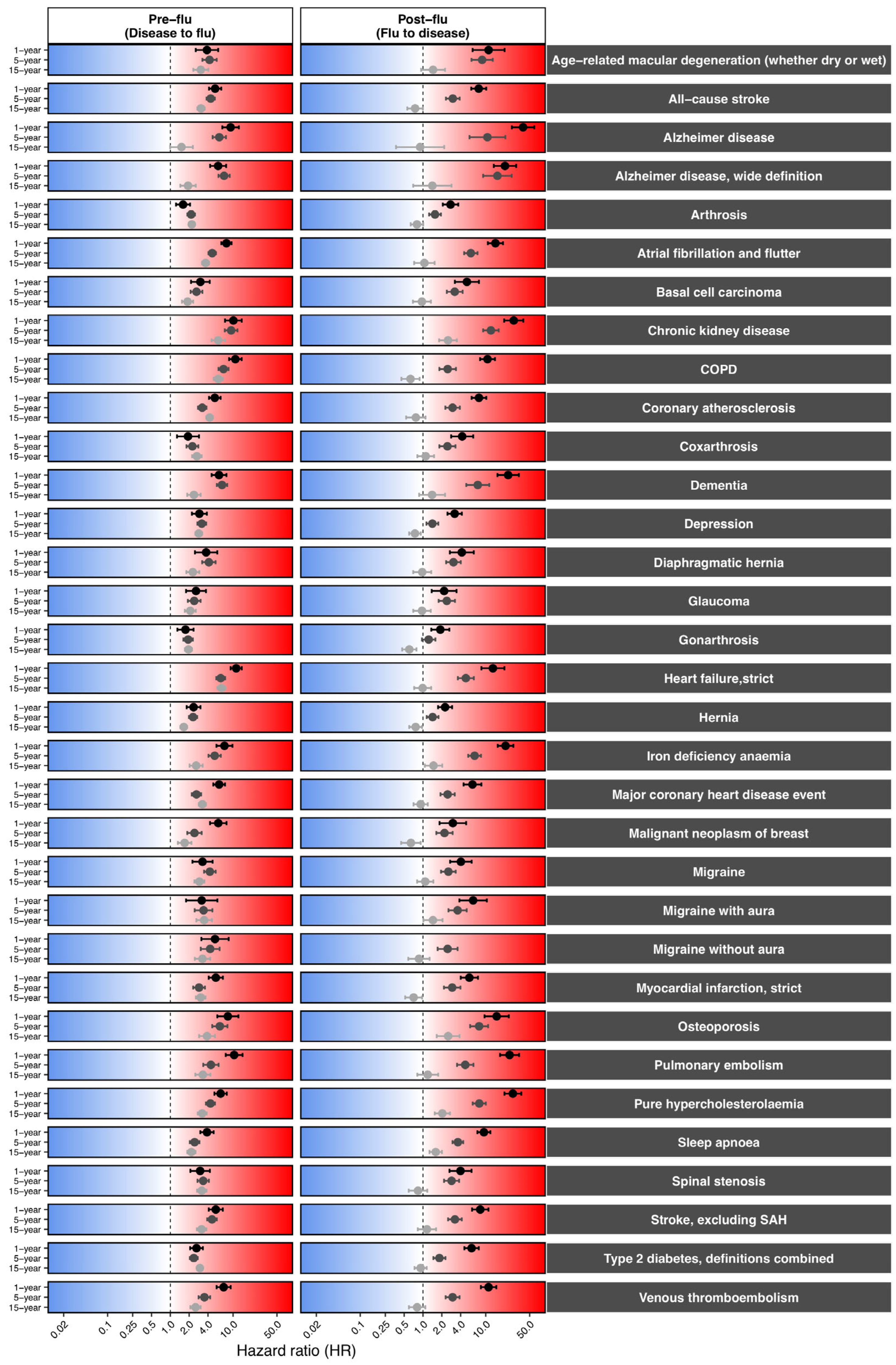 A parallel signature of persistent risk was observed for neurological and psychiatric conditions. Influenza was associated with a long-term increased incidence of neurodegenerative disorders, including migraine (with and without aura), Alzheimer’s disease and dementia, as well as common mental health conditions such as depression. The risk for these conditions was evident within the first year and persisted throughout the one-to-five-year follow-up period (