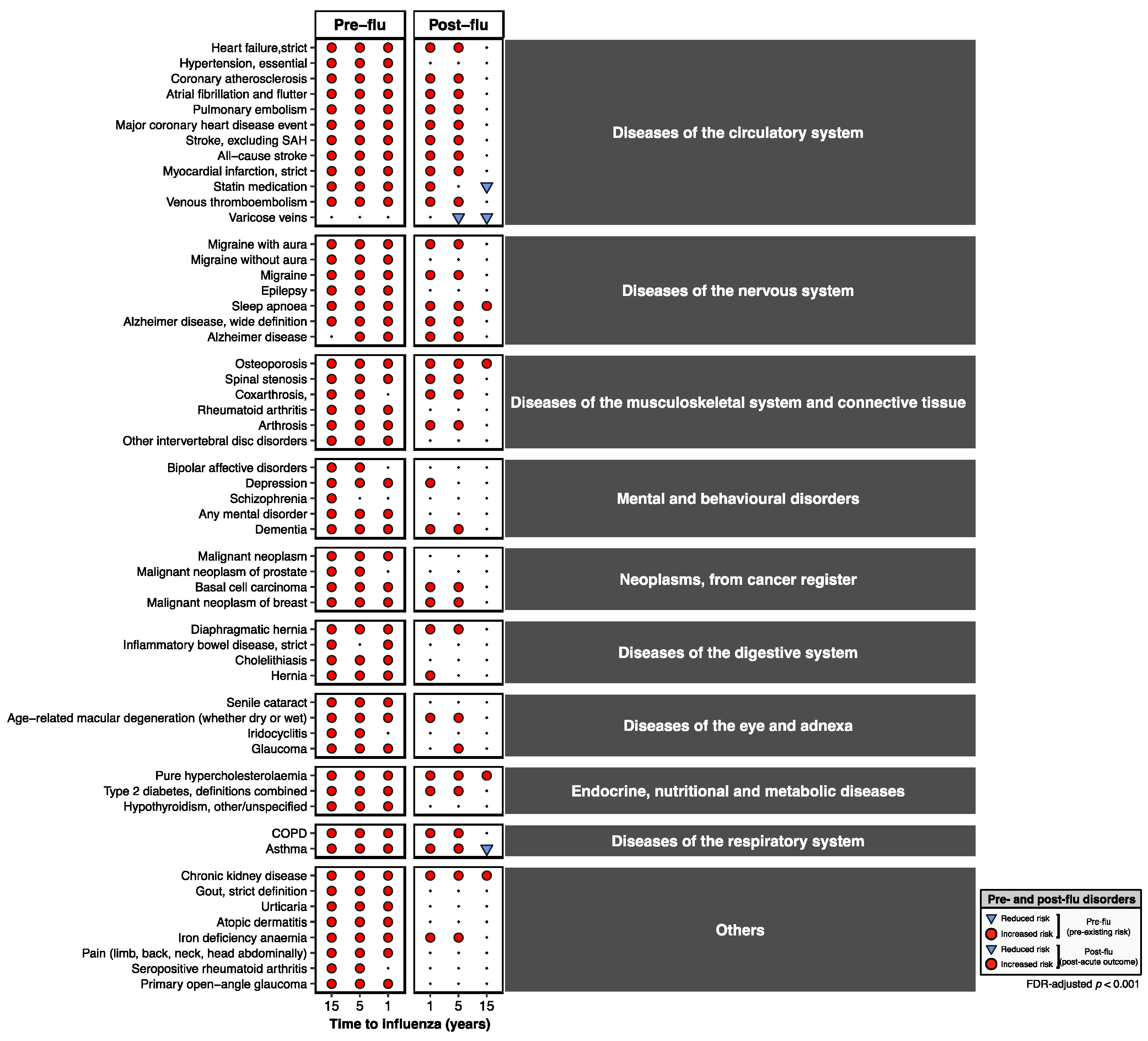This broad pattern of associations underscores that the clinical impact of influenza extends far beyond the acute respiratory tract, implicating it as a significant systemic stressor. The subsequent analyses dissect the temporal nature of these associations, distinguishing between pre-existing conditions that predispose individuals to influenza and the long-term sequelae that define the ‘long flu’ syndrome.