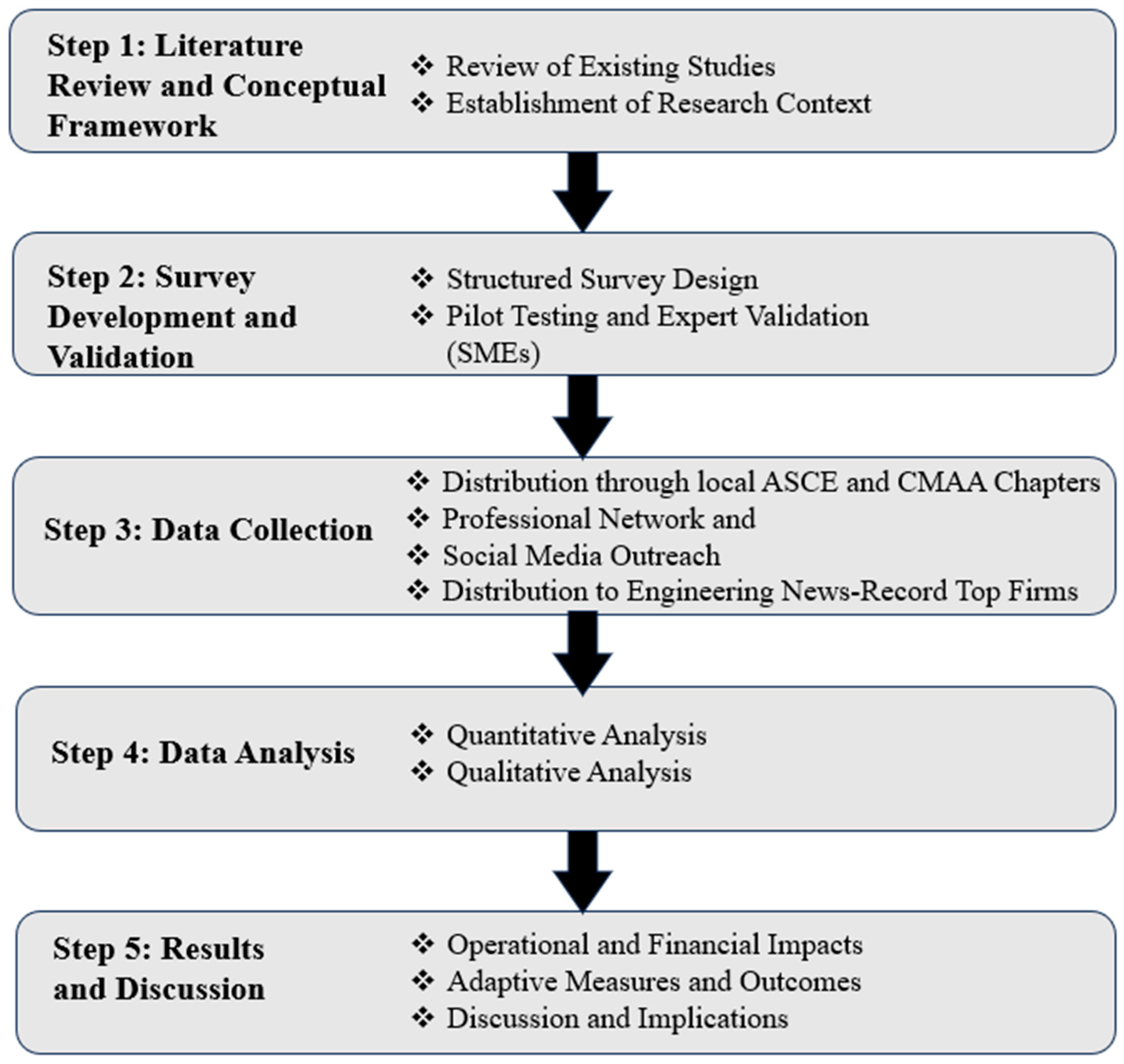 By this stage, many construction and engineering firms had moved beyond immediate crisis responses and begun implementing sustained changes in project management practices, supply chain strategies, and workforce policies. Collecting data during this period allowed participants to reflect on which measures were temporary coping strategies versus those that evolved into permanent operational adjustments. This approach supports a more comprehensive assessment of organizational resilience by capturing not only the initial impacts of the pandemic but also the lessons learned and adaptive mechanisms developed over time.