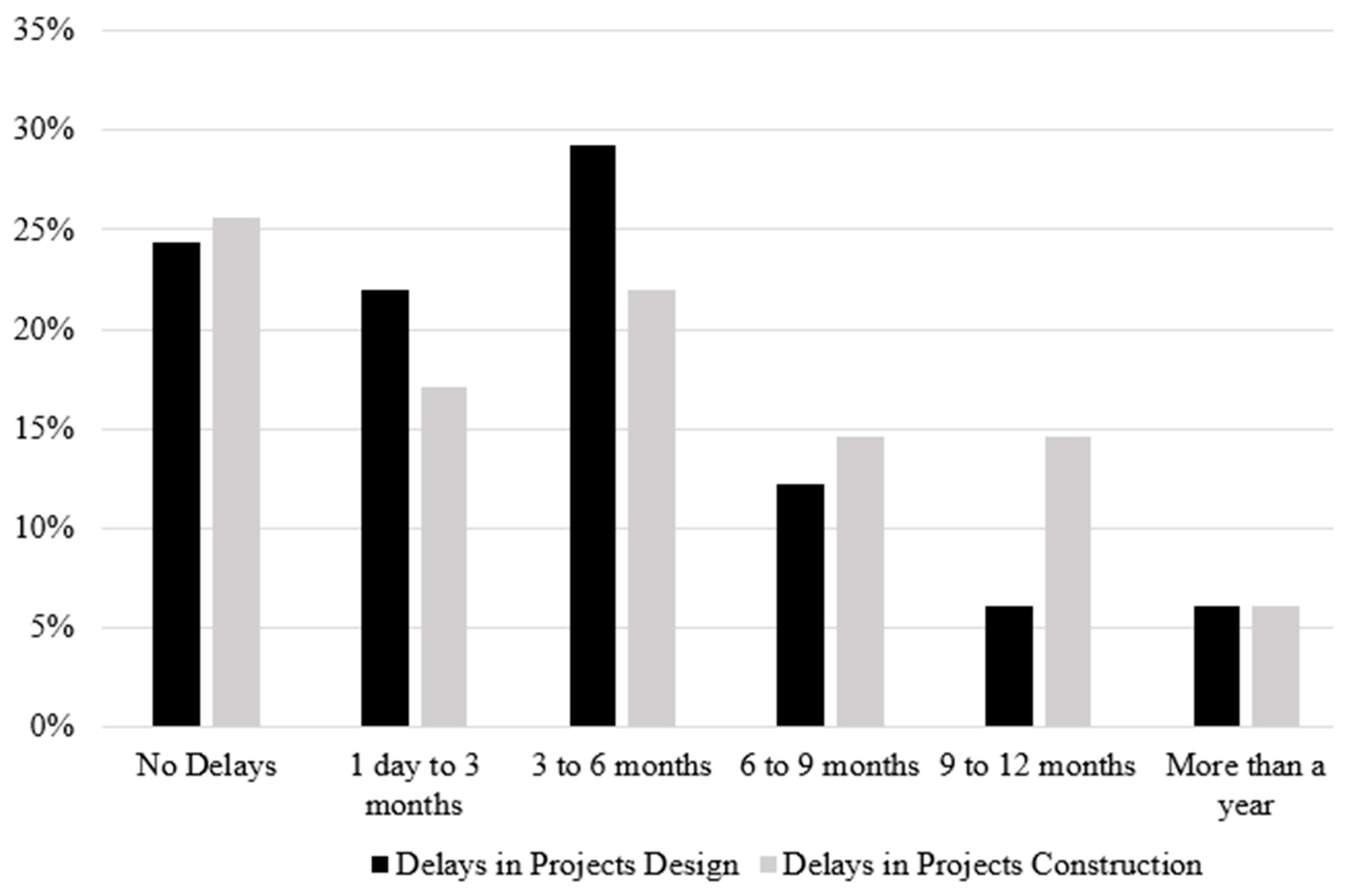 These findings highlight the more severe and widespread impact of the pandemic on the construction phase compared to design, as a higher percentage of respondents experienced delays during the project building process.