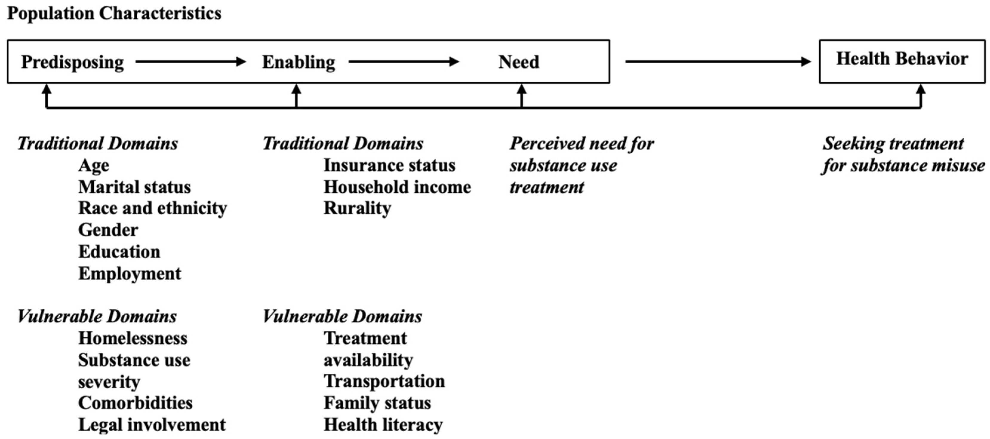 8]. Traditional domains refer to commonly studied individual and structural factors that are theorized to either facilitate or impede treatment seeking, and vulnerable domains capture additional social and structural conditions associated with marginalization that create heightened barriers to accessing care [