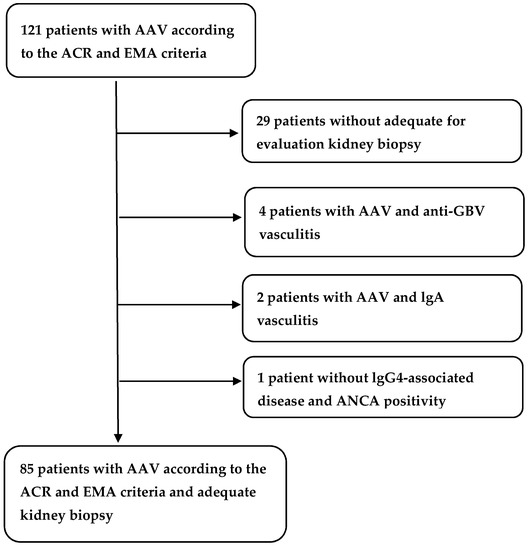 - Chen, Y.-X.; Xu, J.; Pan, X.-X.; Shen, P.-Y.; Li, X.; Ren, H.; Chen, X.-N.; Ni, L.-Y.; Zhang, W.; Chen, N. Histopathological Classification and Renal Outcome in Patients with Antineutrophil Cytoplasmic Antibodies-associated Renal Vasculitis: A Study of 186 Patients and Metaanalysis. J. Rheumatol. 2016, 44, 304–313. [Google Scholar] [CrossRef]