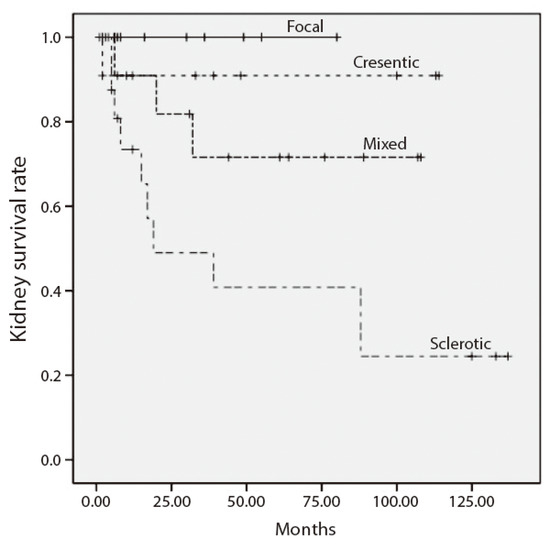 Among 57 patients who received cyclophosphamide followed by azathioprine or methotrexate, kidney survival was 33%, 75%, 86.7% and 100% for sclerotic, mixed, crescentic and focal classes, respectively (p = 0.004). In 12 patients who received rituximab only, kidney survival was 0% for sclerotic class and 100% for mixed, crescentic and focal classes (p = 0.015). In the patients switched from cyclophosphamide to rituximab, kidney survival was 62% for the sclerotic class, 0% for the mixed class, and 100% for the focal and crescentic classes (p = 0.033).