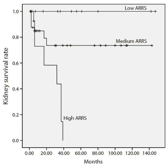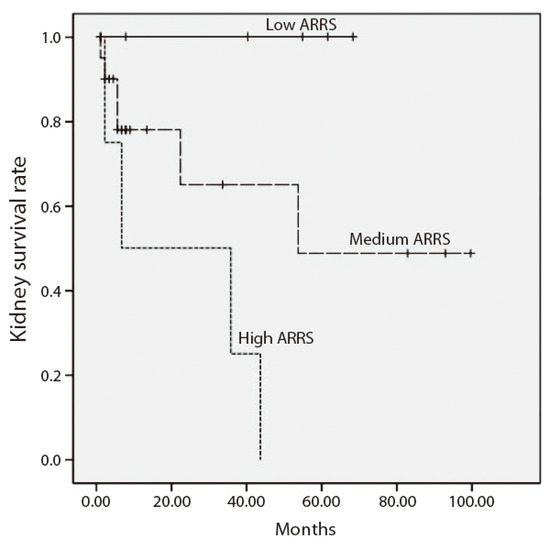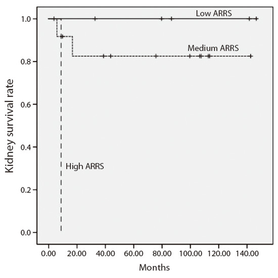 We found a statistically significant correlation between median ARRS at presentation and CKD stage at the end of follow-up (r = 0.490, p < 0.001). The high ARRS group demonstrated unfavorable kidney outcome—kidney survival was 0%, 75.6% and 100% for the high, medium and low groups, respectively (p < 0.001) (Figure 3).