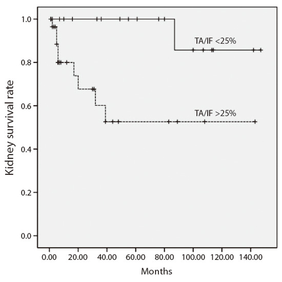 Kidney survival according to the tubular atrophy and interstitial fibrosis ARRS points (T0 < 25%; T2 > 25%) (p = 0.003).