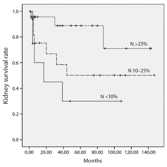 Similarly, the patients with a higher number of damaged glomeruli reached stage 5 CKD significantly more often, compared to those with a lower number of damaged glomeruli: kidney survival 30%, 43.2% and 78.1% for N6, N4 and N0 points, respectively (p = 0.001) (Figure 5).