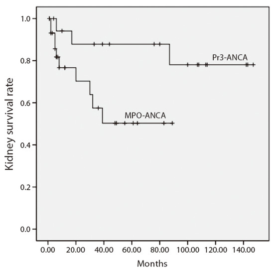 Kidney survival in the patients with anti-MPO-ANCA versus anti-PR3-ANCA (p = 0.045).