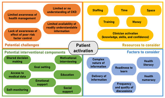 Overview of potential challenges, factors, and components to consider when developing interventions designed to increase patient activation in CKD.