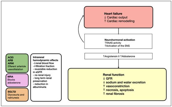 This narrative review summarizes evidence on immediate, and mid- or long-term effects of HF drugs in patients with concomitant kidney dysfunction with or without diabetes mellitus. Given the particularities associated with HF with reduced or preserved ejection fraction (HFpEF), these entities will be discussed separately. Furthermore, this review will discuss the effect of treatment options for advanced HF on kidney function, particularly percutaneous mitral valve repair with the MitraClip, percutaneous intervention for moderate-to-severe tricuspid regurgitation using the TriClip, long-term mechanical circulatory systems (LT-MCSs) and orthotopic heart transplantation (HTx) [8].