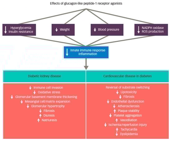 - Cox, E.J.; Alicic, R.; Neumiller, J.J.; Tuttle, K. Clinical evidence and proposed mechanisms for cardiovascular and kidney benefits from glucagon-like peptide-1 receptor agonists. US Endocrinol. 2020, 16, 80–87. [Google Scholar] [CrossRef]