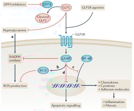 Proposed incretin signaling pathways in kidney cells. Legend: The glucagon-like peptide 1 receptor (GLP-1R) is a G protein-coupled receptor that can be activated by endogenously produced GLP-1 and synthetic GLP-1 receptor agonists. Dipeptidyl peptidase 4 (DPP4) inhibitors indirectly facilitate GLP-1R activation by preventing the rapid degradation of endogenous GLP-1 in circulation. (a,b) GLP-1 receptor agonists may reduce the production of reactive oxygen species (ROS) through receptor-mediated and non-receptor-mediated mechanisms. Haem oxygenase 1 (HO1) is upregulated by GLP-1 receptor agonists and protects against oxidative stress in ischemia-reperfusion injury. (c) GLP-1R activation inhibits the binding of nuclear factor-κB (NF-κB) p65 to its target genes, which may reduce the downstream expression of chemokines, cytokines (such as tumor necrosis factor, IL-1β, IL-6 and transforming growth factor-β), and pro-fibrotic factors and adhesion molecules (such as intercellular adhesion molecule 1, vascular cell adhesion molecule 1, and E-selectin). (d) Administering a DPP-4 inhibitor to mice reduced the ratio of the apoptosis regulator BAX to the apoptosis regulator BCL-2, and the ratio of BCL-2-like protein 11 to BCL-2; this effect suggests a decrease in apoptosis. Whether this anti-apoptotic effect is directly medicated by DPP4 inhibitors or by GLP-1R activation is uncertain. Reprinted with permission from Ref. [28].