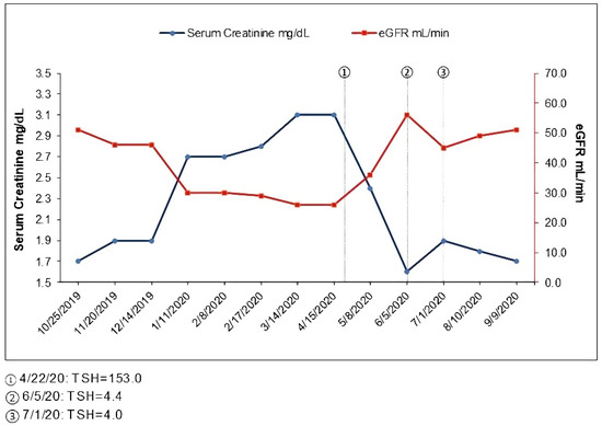 During subsequent weeks, he noted some mild leg swelling but also had been started on nifedipine XL; otherwise, he had no new symptoms. Upon further evaluation, in April 2020, he was noted to have some thyroid fullness, and a thyroid stimulating hormone (TSH) test was performed, with results showing elevated levels at 153 mcIU/mL (reference range 0.47–4.68 mcIU/mL), while free T4 was <0.07 ng/dL (reference 0.6–2.5 ng/dL) consistent with hypothyroidism. The patient had no prior history of any thyroid disorder. A thyroid peroxidase antibody was elevated at 477 IU/mL (reference < 9 IU/mL). He was started on 100 mcg levothyroxine. He felt symptomatically better after the start of the thyroid supplement and felt his voice normalize; he lost the weight he had gained over the preceding months. Serum creatinine was 3.1 as of April 2020 but was 2.4 mg/dL in May 2020 and 1.6 in June 2020, at which time his repeat TSH was normal (Figure 1, Table 1). The patient had acute worsening of his renal function in the setting of severe hypothyroidism that completely resolved with achievement of the euthyroid state. Renal function since remained at his baseline with a serum creatinine in the 1.7 to 1.9 mg/dL range (Figure 1, Table 1).