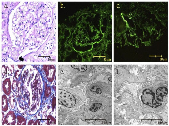 (a,d) 40× photomicrographs stained with H&E and Masson’s trichrome respectively; the arrows show the lesions of the focal and segmental sclerosis, affecting the tubular pole, with endothelial edema. (b,c) 40× photomicrograph of the direct immunofluorescence study, which was negative for all the immunoreactants. (e,f) Electron photomicrograph 800× magnification, showing diffuse obliteration of the podocyte processes.