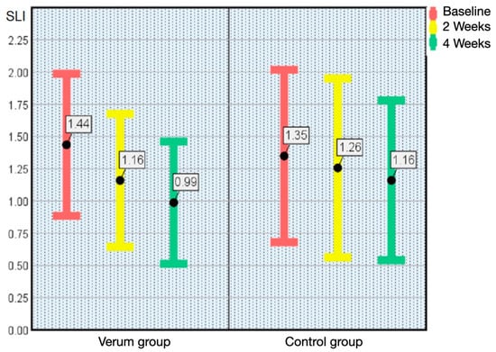 The trend of improving oral health continued in the verum group at the final examination, and some pronounced differences could be assessed: the frequency of dry mouth and dry mouth during dialysis both improved significantly, the SLI plaque index decreased (Figure 1) and the number of gingivitis affected teeth and periodontitis affected teeth decreased (p < 0.05) (Figure 2).