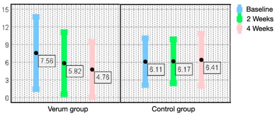 Individual oral health-related quality of life assessed using OHIP-14 started with a rather low dental impact on quality of life in both groups with a mean code at 6.25 in the control group and 6.62 in the verum group. At the final examination, a statistical improvement with a mean code at 4.75 in the verum group was documented. Taking all patients together, the OHIP-14 code ranged from 0 to 23 at baseline and from 0 to 18 at the end of the study. Comparing the mean OHIP-14 code 0–9 of all patients (no impact and very little impact of oral health on quality of life) with mean code 10–28 (occasionally to fairly often), the slight improvement is significantly different between the two groups. This is supported by four verum group patients at baseline versus seven patients at the end of the study having never experienced any dental/oral impact on quality of life during the previous month (OHIP-14 code 0).