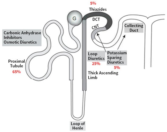 Figure 1 modified from [1] illustrates the sites of action in the nephron of different diuretics in relation to the percentage of filtrate reabsorption at the different nephron segments.