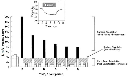 Effects of diuretics on urinary Na excretion and extracellular fluid (ECF) volume. Inset: effect of a diuretic on body weight, taken as an index of ECF volume. Bars represent 6-hour periods before (in Na balance) and after doses of loop diuretic (D). The dotted line indicates dietary Na intake. The solid portion of the bars indicates the amount by which Na excretion exceeds intake during natriuresis. The hatched areas indicate the amount of positive Na balance after the diuretic effect has worn off. Net Na balance during 24 h is the difference between the hatched area (postdiuretic NaCl retention) and the solid area (diuretic-induced natriuresis). After the first dose of the diuretic the excess natriuresis triggers a compensatory post-diuretic sodium reabsorption of equal magnitude, resulting in a net even sodium balance (compensatory post diuretic sodium reabsorption). With chronic administration of the same dose of diuretic, chronic adaptation is indicated by progressively smaller peak natriuretic effects (the braking phenomenon) and is mirrored by a return to neutral balance, as indicated in the inset, where the solid and hatched areas are equal. Note that steady state is reached within 6–8 days, despite continued diuretic administration. Reprinted with permission from Ref. [67]. 2022, Karger.