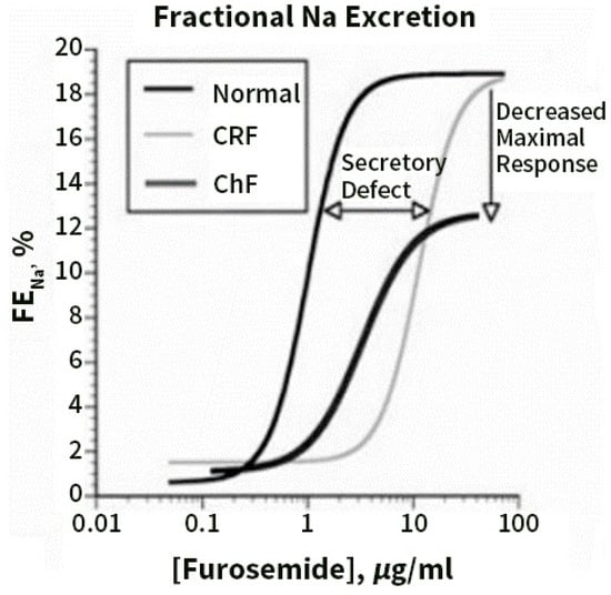 Dose–response curves for loop diuretics illustrate the fractional Na excretion (FENa) as a function of loop diuretic urine concentration. Compared with normal patients, patients with chronic renal failure (CRF) show a rightward shift in the curve, owing to impaired diuretic secretion. The maximal response is preserved when expressed as FENa, but not when expressed as absolute Na excretion. Patients with congestive heart failure (CHF) demonstrate a rightward and downward shift, even when the response is expressed as FENa, and thus are relatively diuretic resistant. Reprinted with permission from Ref. [67]. 2022, Karger.