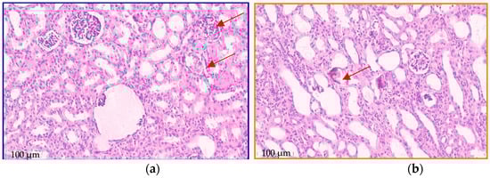 Kidney biopsy: light microscopic features. (a) Dysmorphic glomeruli; some glomeruli are globally and segmentally sclerosed (red arrows). (b) Calcium oxalate crystals in the tubules (red arrows). Scale bar 100 µm.