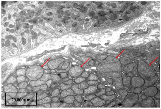 Kidney biopsy: electron microscopy. Cluster of large malformed mitochondria in a tubule cells. Mitochondria with an enlightened matrix, absent or single cristae (red arrows). Scale bar 20,000 µm.