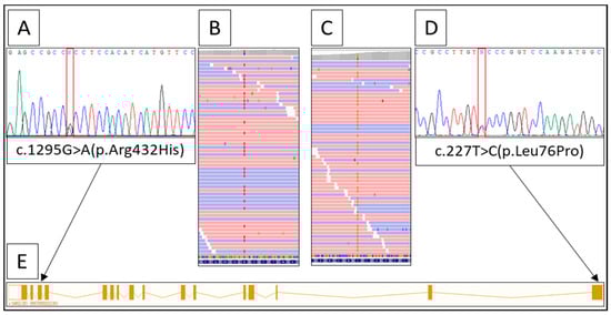 Result of the molecular analysis. (A) Sanger sequencing of the SARS2 gene, exon 14 fragment. (B) IGV-browser with the fragment of exon 14, showing c.1295G > A (p.Arg432His) in heterozygous state. (C) IGV-browser with the fragment of exon 1, showing c.227T > C (p.Leu76Pro) in heterozygous state. (D) Sanger sequencing of the SARS2 gene, exon 1 fragment. (E) Scheme of the SARS2 transcript.