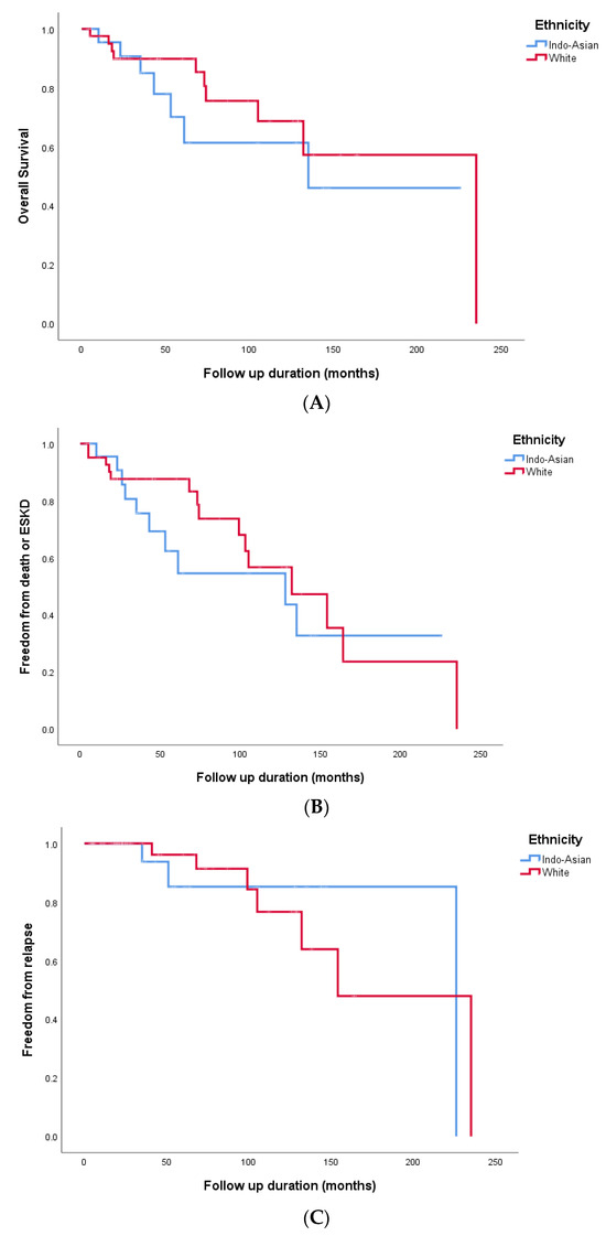 Outcomes including relapse, progression to ESKD and mortality were determined. There were no significant differences between the two groups and any of these outcomes (Figure 2A–C). Relapse occurred in 16.7% in each group (p = 0.382), progression to ESKD occurred in 20.8% of the Indo-Asian group and 19% of the White group (p = 0.861) and mortality occurred in 29.2% of the Indo-Asian group and 23.8% of the White group (p = 0.632). There was also no significant difference between one- and five-year mortality.