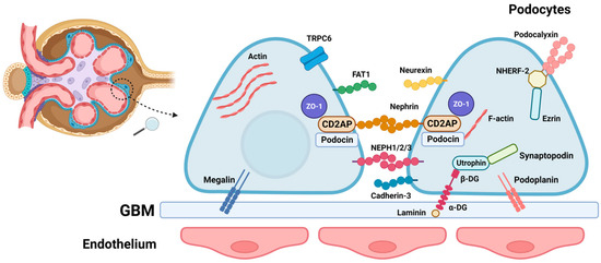 Podocytes are highly specialized and polarized epithelial cells related to the synthesis of extracellular matrix components of the GBM. Furthermore, these cells have a structural role in supporting the glomerular capillaries with their interdigitating foot processes (FP), which are linked to each other through a special cell–cell junction, the slit diaphragm (SD). The podocyte also synthesizes many proteins from the SD. The unique zipper-like architecture of the SD is essential to the glomerulus permeability; therefore, podocyte depletion due to detachment, apoptosis, or necrosis is a critical step in the development of NS [7].