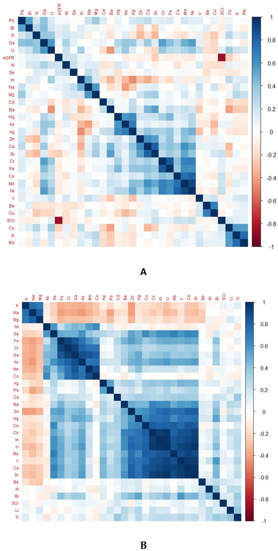 Variations in TE levels in the CKD groups may be due to either their accumulation due to impaired renal function, intermittent toxic exposure, or a combination of both factors. In the subsequent step, we examined the relationship between TEs and eGFR to investigate this possibility (Table 4).