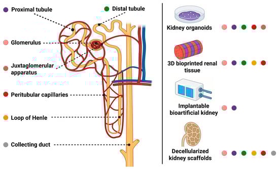 Functional map of the nephron and corresponding nephron replacement strategies (created in https://BioRender.com, accessed on 19 August 2025). The nephron diagram (left) is color-coded by anatomical segment. Each strategy (right) is accompanied by colored dots that correspond to the nephron segments it aims to replicate. The dots indicate functional coverage, not anatomical reconstruction, and reflect the primary targets of each strategy based on current evidence.
