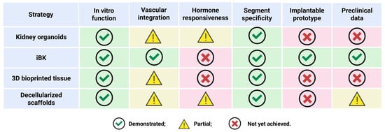 Translational readiness matrix for nephron replacement strategies (created in https://BioRender.com, accessed on 15 June 2025). Abbreviations: iBK, implantable bioartificial kidney. Supporting studies: Kidney organoids—in vitro function [8,11,13,14]; vascular integration [17,18,19,74,75,76]; hormone responsiveness [19,20,69,70,71]; segment specificity [11,13,14]; preclinical data [20,47,78]. iBK—in vitro function [8,22,23,24,25,51,52,53,54]; vascular integration [8,22,25,26,27,74,75,76]; segment specificity [22,23,24,51,52,53,54]; implantability [25,26,27]; preclinical data [26,27,28,78]. 3D bioprinting—in vitro function [29,30,31,32,33,51,52,53,54]; vascular integration [32,33,74,75,76]; segment specificity [29,31,32,33,51]; preclinical data [35,36]. Decellularized scaffolds—in vitro function [10,38,39,40,41,57]; vascular integration [39,40,41,48,74,75,76]; hormone responsiveness [43]; segment specificity [10,38,40,57]; preclinical data [10,38,41,48,57].