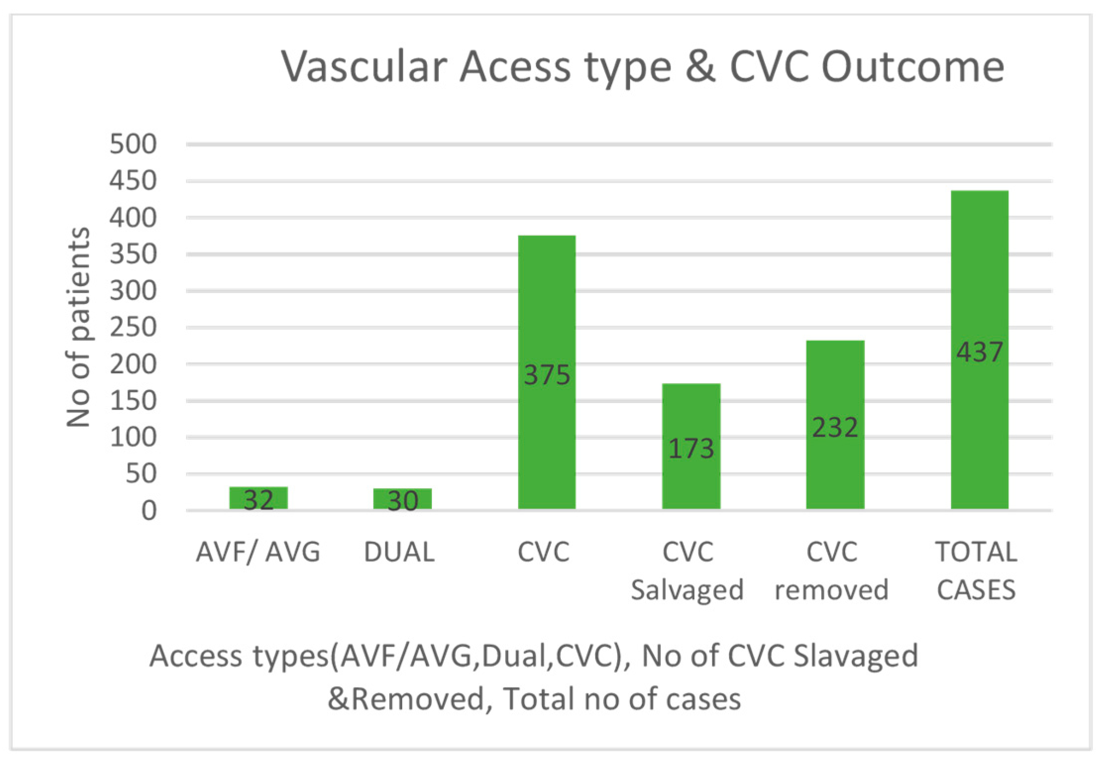 There are three types of vascular access: central venous catheter (CVC), arteriovenous fistula (AVF), and dual access. The study revealed 375 positive blood cultures in patients with CVC, 32 in those with AVF or grafts, and 30 in dual access patients. Patients with CVC needed more hospital treatments and had a significantly greater rate of loss of access (