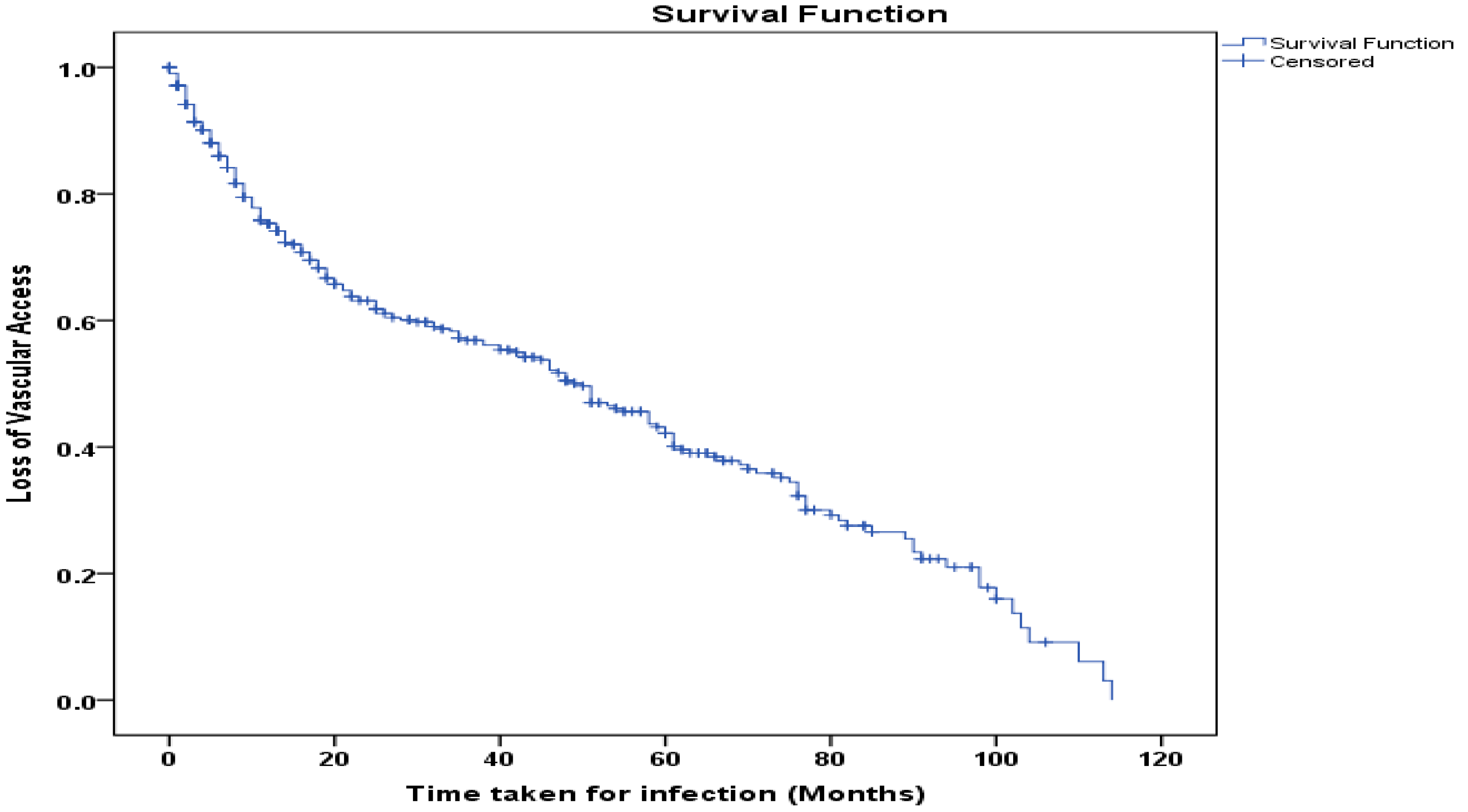 Figure 4) shows the period in months (beginning of hemodialysis till loss of access) of loss of vascular access due to infection among patients. The probability of maintaining vascular access declines over a period of time. At the median time of 50 months, approximately 50% of the patients retained vascular access. By the end of the observation period (approx. 115 months), less than 10% of patients had retained access. Overall, the curve depicts a progressive decline in vascular access, revealing long-term risks of infection among patients.