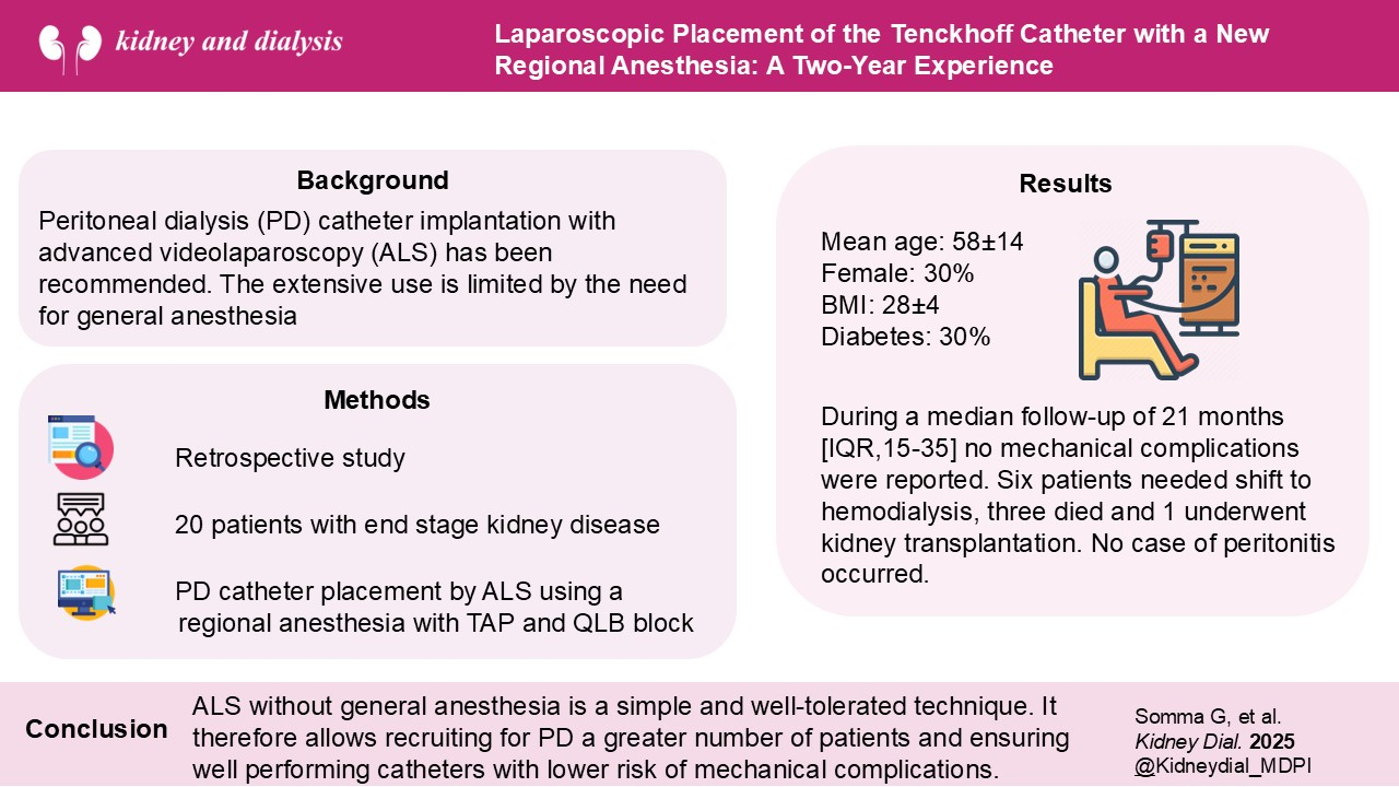 Somma G, Ruotolo C, Auricchio MR, Cappiello A, De Luca M, Selvaggi L, Romano FM, Capozzi F, Marzano F, Borrelli S, et al. Laparoscopic Placement of the Tenckhoff Catheter with a New Regional Anesthesia: A Two-Year Experience. Kidney and Dialysis. 2025; 5(4):55. https://doi.org/10.3390/kidneydial5040055