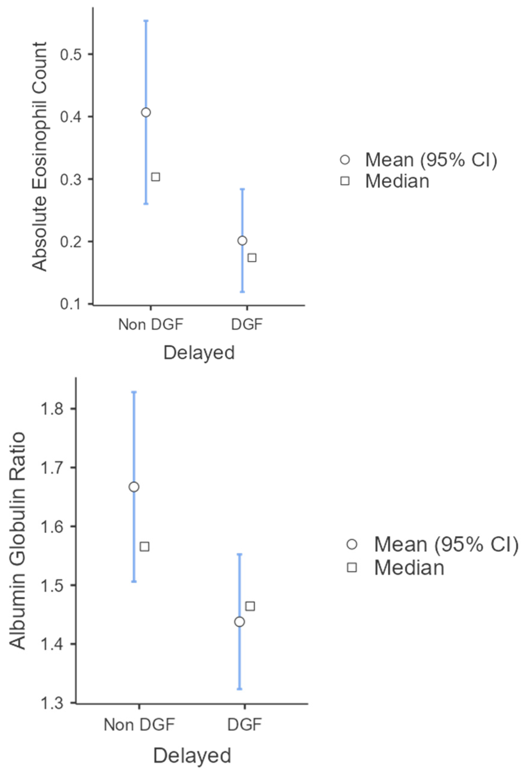 APA StyleChoudhary, A., Krishnakanth, A. V. B., Surag, K. R., Viswanath, K., Shah, A., Pillai, S., & Hegde, P. (2025). Absolute Eosinophil Count and Albumin–Globulin Ratio as Predictors of Delayed Graft Function in Deceased Donor Kidney Transplant: A Retrospective Analysis. Kidney and Dialysis, 5(4), 56. https://doi.org/10.3390/kidneydial5040056