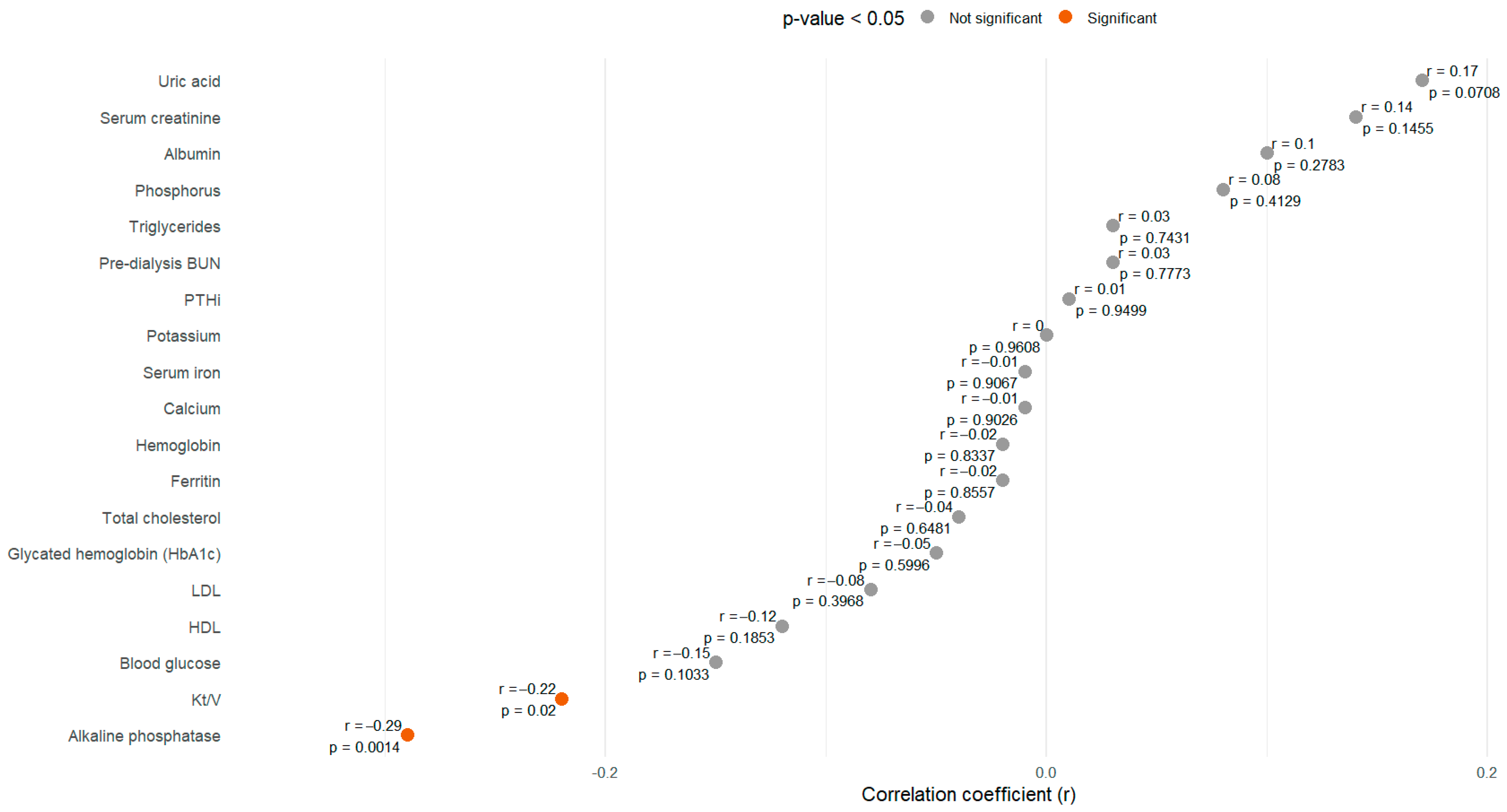 p = 0.001), both weak in magnitude. No meaningful associations were found with other parameters such as creatinine, phosphorus, calcium, PTHi, or lipid profile. Full results are illustrated in