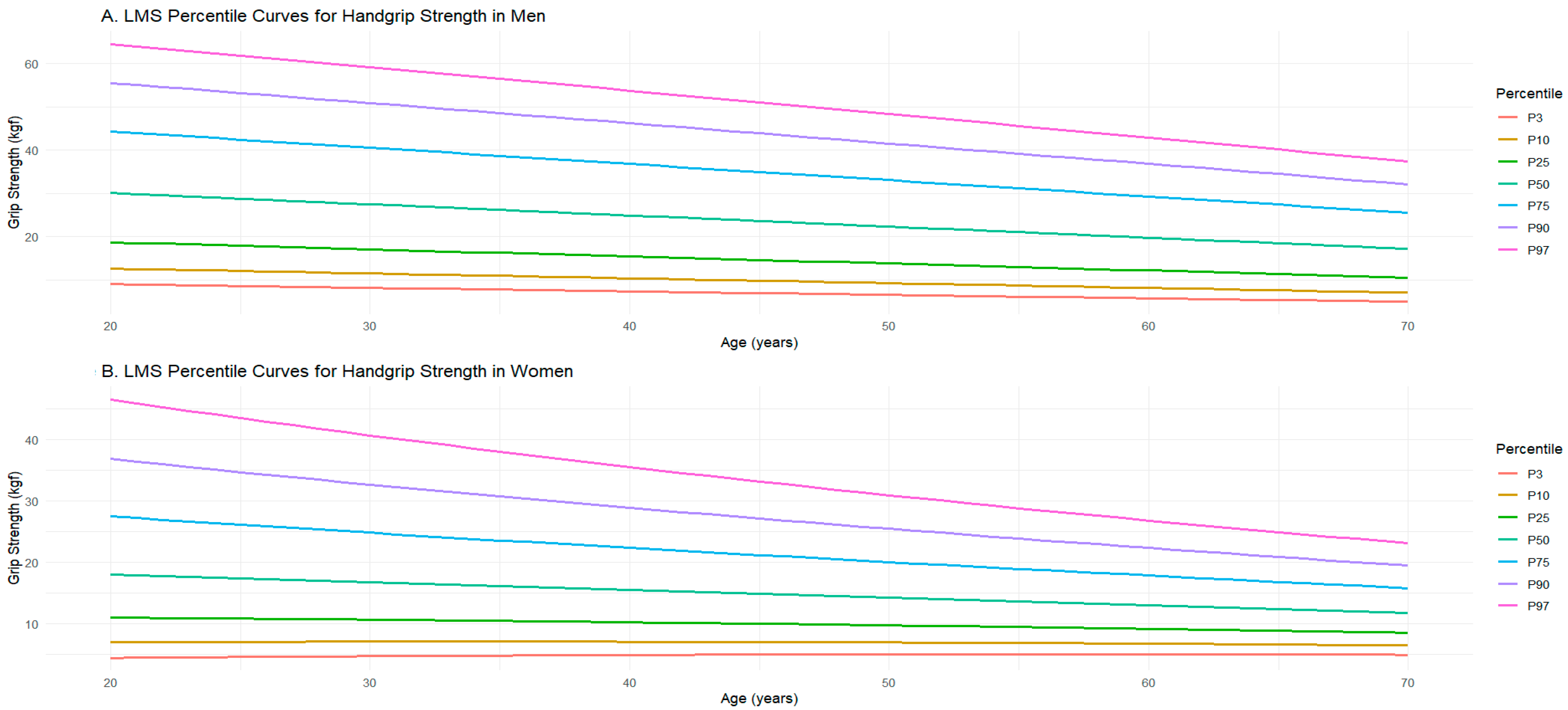 The use of GAMLSS modeling allowed for a robust statistical estimation of percentiles, enhancing the clinical applicability of the findings. Moreover, the observed differences by sex and the decline with age underscore the need for individualized interpretation when evaluating muscular strength in this context.