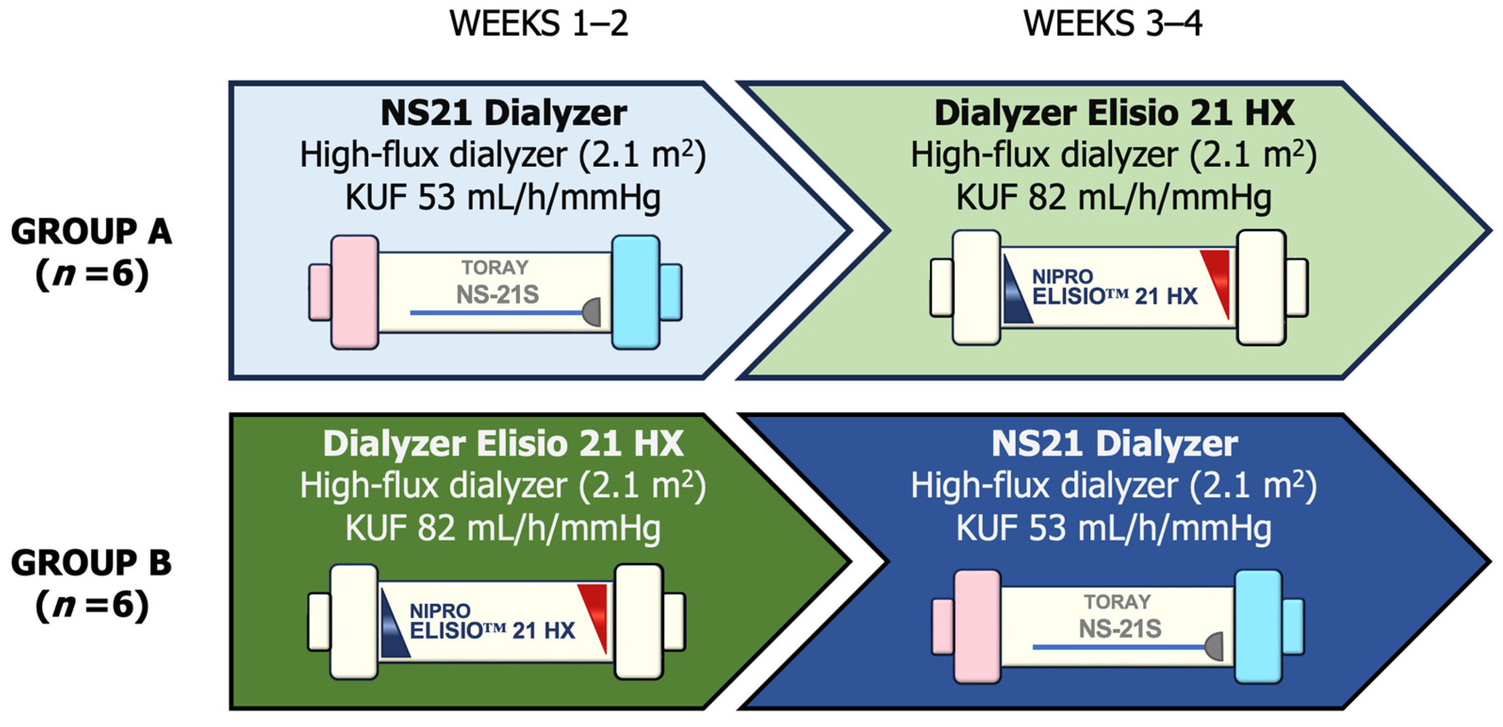 - Armenta-Alvarez, A.; Lopez-Gil, S.; Osuna, I.; Grobe, N.; Tao, X.; Ferreira Dias, G.; Wang, X.; Chao, J.; Raimann, J.G.; Thijssen, S.; et al. Removal of Middle Molecules and Dialytic Albumin Loss: A Cross-over Study of Medium Cutoff and High-Flux Membranes with Hemodialysis and Hemodiafiltration. Kidney360 2023, 4, 1095–1102. [Google Scholar] [CrossRef]